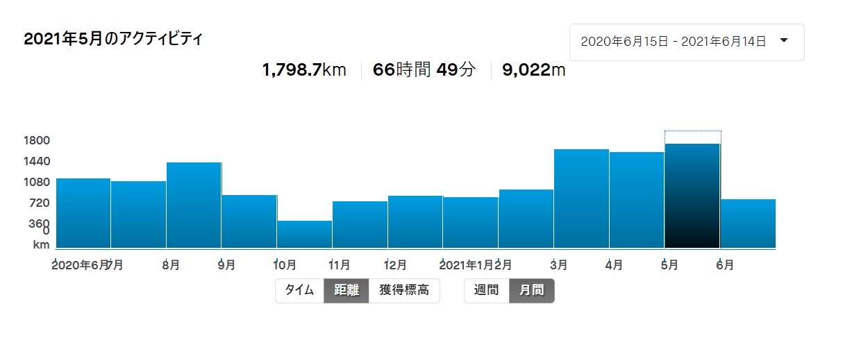 月に2000㎞(今の自分にはちょっときつい)を目標として設定している中で、この時間でこの距離は、がんばれてる方かなっと思ってたり。