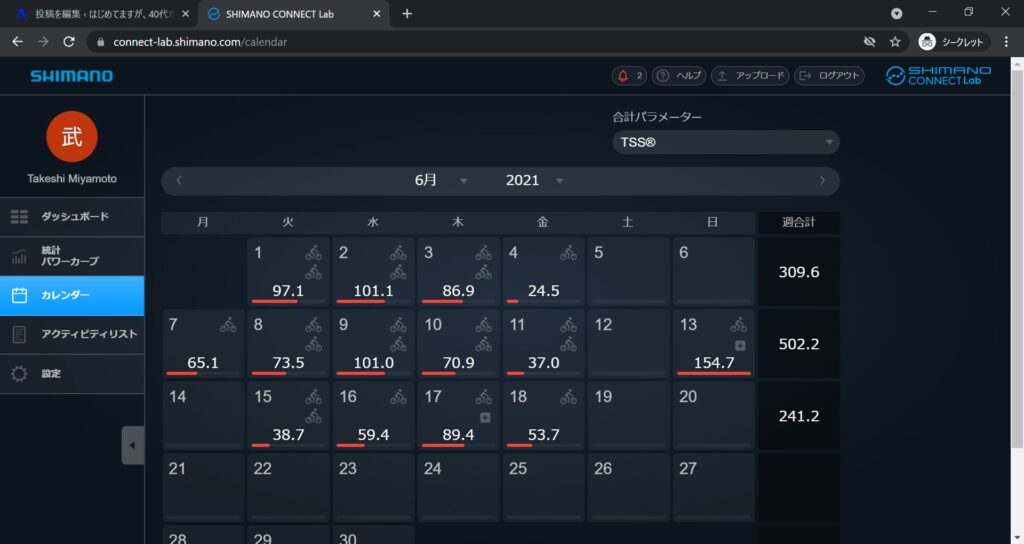 走行距離や時間、TSSが日、週、月で合計されてカレンダーで表示されるのはうれしい。各項目はプルダウンで切り替えが可能。地味に使える機能かなっと個人的には思っています。